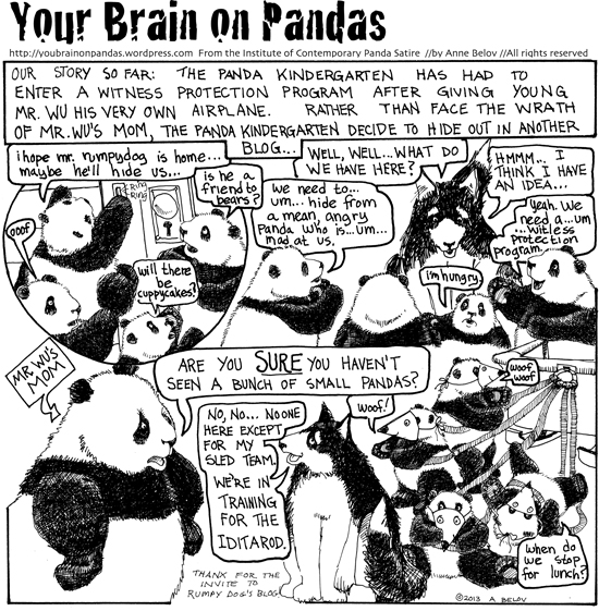 Posted by Bob T Panda | May 16, 2013, 5:19 PMHi Rumpy! Thanks for hiding the panda kindergarten from Mr. wu’s mom, who is not really evil, she’s just mad. (and who wouldn’t be? Those are some VERY naughty pandas.) I’m sure they’ll win the Iditarod, though.